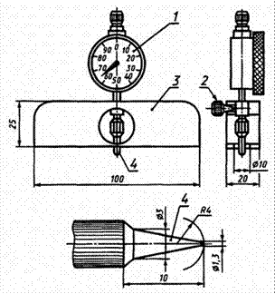 Рисунок 1.5 – Профилограф индикаторный 1 – шкала индикатора; 2 – стопорный винт; 3 – колодка; 4 – измерительный наконечник