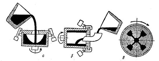 В зависимости от размеров и конфигурации отливки применяют центробежные машины с горизонтальной, вертикальной и наклонной осью вращения (рис. 2.3).