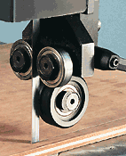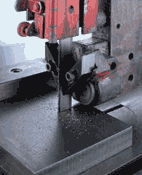 Фрикционная резка листового материала основана на использовании сил трения, возникающих при движении по материалу быстро бегущей ленты (рис. 2.10 и 2.11). Скорость ленты колеблется от 1000 до 4000 м/мин. Для резки металлов большой толщины и материалов органического происхождения применяют ленту с зубьями. Зубья в данном случае служат для удаления из разреза частиц материала (рис. 2.10).