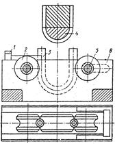 1 – упор, 2 – нижние опорные ролики, 3 – отвод, 4 – пуансон, 5 – ось ролика, 6 – корпус.