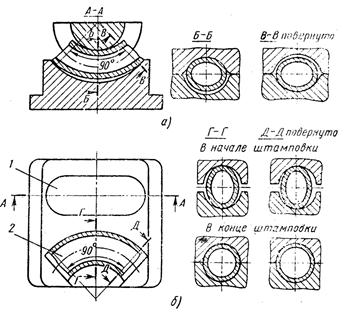 Рис. 2.19 – Схема горячей штамповки отводов из труб без внутренней поддержки: а – гибочный ручей штампа (сомкнут); б – формовочный ручей штампа (до смыкания половин штампа и после смыкания); 1 – гибочный ручей штампа; 2 – калибровочный ручей штампа.