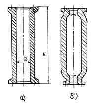 Корпус аппарата высокого давления представляет собой толстостенный стальной цилиндр, который в зависимости от назначения и способа изготовления может выполняться открытым с одного или с обоих концов. Корпуса колонн синтеза, вмещающие катализаторные коробки и теплообменные устройства, выполняют с верхним отверстием, диаметр которого равен внутреннему диаметру корпуса (рас. 23.1, а). Для аппаратов без сменных внутренних частей или с насадкой малого диаметра применяют корпуса с зауженной горловиной и неотъемным днищем, с тем, чтобы улучшить условия герметизации сосудов (рис. 23.1, б).