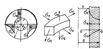 Общее напряженное состояние материала распределено весьма неравномерно по сечению стенки. Радиальные и кольцевые напряжения распределяются по гиперболическому закону.