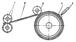 | Рисунок 23.7 – Профильная лента | Рисунок 23.8 – Схема изготовления оплеточных обечаек: 1 – ролики направляющие; 2 - лента; 3 – ролик прижимной; 4 – гильза; 5 – форсунка |