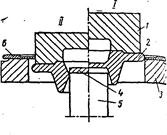 Рисунок 27.2 – Комбинированный штамп для прошивки отверстия и обрезки заусенцев (I – начальное положение штампа; II – положение штампа после обрезки и прошивки): 1 – обрезной пуансон; 2 – поковка; 3 – обрезная матрица; 4 – выдра; 5 – прошивной пуансон; 6 – заусенец | Рисунок 27.3 – Штамп для безоблойный штамповки фланцев: 1 — верхняя часть; 2 — нижняя часть |
