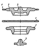Рисунок 27.4 – Совмещенная штамповка фланцев: 1 – заусенец; 2 – основная поковка; 3 – дополнительная поковка