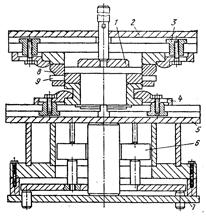 Рисунок 27.5 – Штамп для вырубки фланцев: 1, 7 – выталкиватели; 2 – верхняя плита; 3 –гайка; 4 – прижимная скоба; 5 – нижняя плита; 6 – кольцо; 9 – заготовка фланца; 9 – отход
