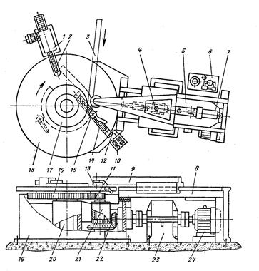 21 – вал; 22 – коническая передача; 23 – редуктор; 24 – электродвигатель