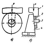 Рисунок 27.9 – Схема раскатки кольцевой заготовки на скобе с двумя опорными плечами (а) и на роговой оправке (б): 1 – верхний боек; 2 — заготовка; 3 - рог; 4 — нижний боек