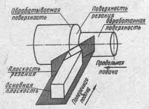 Для определения углов резца установлены понятия: плоскость резания и основная плоскость. Плоскостью резания называют плоскость, касательную к поверхности резания и проходящую через главную режущую кромку резца (смотри рисунок). Основной плоскостью называют плоскость, параллельную направлению продольной и поперечной подач; она совпадает с нижней опорной поверхностью резца.