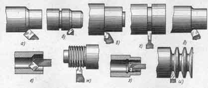 а - наружное обтачивание проходным отогнутым резцом, б - наружное обтачивание прямым проходным резцом, в - обтачивание с подрезанием уступа под прямым углом, г - прорезание канавки, д - обтачивание радиусной галтели, е - растачивание отверстия, ж, з, и - нарезание резьбы наружной, внутренней и специальной