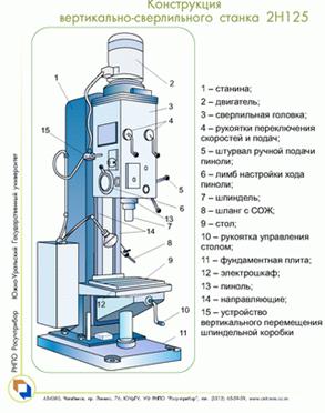 Сверло имеет: две главные режущие кромки, образованные пересечением передних винтовых поверхностей канавок, по которым сходит стружка, с задними поверхностями, обращенными к поверхности резания; поперечную режущую кромку (перемычку), образованную пересечением обеих задних поверхностей; две вспомогательные режущие кромки, образованные пересечением передних поверхностей с поверхностью ленточки. Ленточка сверла - узкая полоска на его цилиндрической поверхности, расположенная вдоль винтовой канавки и обеспечивающая направление сверла при резании. Угол наклона винтовой канавки ω угол между осью сверла и касательной к винтовой линии по наружному диаметру сверла (ω=20-30 градусам). Угол наклона поперечной режущей кромки (перемычки) φ - острый угол между проекциями поперечной и главной режущих кромок на плоскость, перпендикулярную оси сверла (φ=50-55 градусам). Угол режущей части (угол при вершине) 2φ - угол между главными режущими кромками при вершине сверла (2φ=118 градусам). Передний угол γ - угол между касательной к передней поверхности в рассматриваемой точке режущей кромки и нормалью в той же точке к поверхности вращения режущей кромки вокруг оси сверла. По длине режущей кромки передний угол γ является величиной переменной. Задний угол α - угол между касательной к задней поверхности в рассматриваемой точке режущей кромки и касательной в той же точке к окружности ее вращения вокруг оси сверла. Задний угол сверла - величина переменная: α=8-14 градусов на периферии сверла и α=20-26 градусов - ближе к центру сверла.