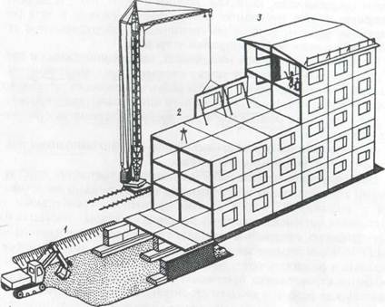 Рис. 1.4. Группирование строительных работ по циклам: 1 —подземный цикл; 2 — надземный цикл; 3 —отделочный цикл