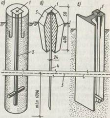 а—из забетонированных обрезков труб; б—из стального штыря с забетонированным оголовком; в — из обрезков рельсов; / — плановая точка; 2 — стальная труба с крестообразным анкером; 3 — бетонный оголовок; 4—стальная труба; 5 — граница промерзания