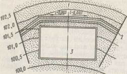 Территория площадки должна быть защищена от поступления «чужих» поверхностных вод, для чего их перехватывают и отводят за пределы площадки. Для перехвата вод делают нагорные водоотводные канавы или обваловывание вдоль границ строительной площадки в повышенной ее части (рис. 3.3). Водоотводные канавы должны обеспечивать пропуск ливневых и талых вод определенных расходов. Их устраивают глубиной не менее 0,5 м, шириной 0,5... 0,6 м, с высотой бровки над расчетным уровнем воды не менее чем на 0,1...0,2 м. Для предохранения лотка канавы от размыва скорость движения воды не должна превышать для песка 0,5...0,6 м/с, для суглинка —1,2... 1,4 м/с. Канаву устраивают на расстоянии не менее 5 м от постоянной выемки и 3 м от временной. Для предотвращения возможного заиливания продольный профиль водоотводных канав делают не менее 0,002. Стенки и дно канав укрепляют дерном, камнями.