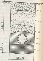 Их устраивают в виде канав глубиной 0,5...0,7 м, на дно которых укладывают слой крупнозернистого песка, гравия или щебня толщиной 10... 15 см. Закрытый дренаж — это обычно траншеи с уклонами в сторону сброса воды, заполняемые дренирующим материалом (щебень, гравий, крупный песок). При устройстве более эффективных дренажей на дно такой траншеи укладывают перфорированные в боковых поверхностях трубы — керамические, бетонные, асбестоцементные, деревянные (рис. 3.4). Такие дренажи собирают и отводят воду лучше, так как скорость движения воды в трубах выше, чем в дренирующем материале. Закрытые дренажи должны быть заложены ниже уровня промерзания грунта и иметь продольный уклон не менее 0,005.