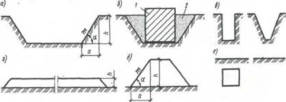 а —открытый котлован; б —закрытый котлован; в—траншея; г —планировочная насыпь; д —земляное полотно дороги; е —подземная выработка; / —здание (сооружение); 2 — обратная засыпка