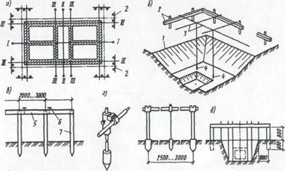 а —схема разбивки котлована; б —схема обноски; в —элементы обноски разового использования; г—инвентарная металлическая обноска; д—схема разбивки траншеи; / — /и // — // — главные оси здания; /// — /// — оси стен здания; /—границы котлована; 2—обноска; 3 — проволока (причалка); 4—отвесы; 5—доска; 6 — гвоздь; 7 — стойка