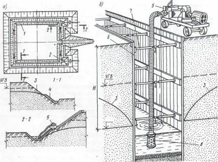 Рис. 5.3. Открытый водоотлив из котлована (а) и траншеи (б):