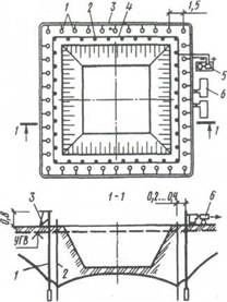 При открытом водоотливе грунтовая вода, просачиваясь через откосы и дно котлована, поступает в водосборные канавы и по ним в приямки (зумпфы), откуда ее откачивают насосами (рис. 5.3). Водосборные канавы устраивают шириной по дну 0,3...0,6 и глубиной 1...2 м с уклоном 0,01...0,02 в сторону приямков. Приямки в устойчивых грунтах крепят деревянным срубом из бревен (без дна), а в оплывающих —шпунтовой стенкой.