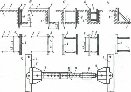 Рис. 5.5. Схемы временного крепления вертикальных стенок выемок (размеры в м): а—шпунтовое ограждение; 6—консольное; в—консольно-распорное; г—распорное (горизонтально-рамное); д—подкосное; е—инвентарная трубчатая распорная рама; I—анкерная свая; 2—оттяжка; 3—маячная свая (опорная стойка); 4—направляющая; 5—шпунтовое ограждение; 6 —шиты (доски); 7—стойка распорной рамы; 8 — распорка; 9 — наружная труба; 10— внутренняя труба; //—поворотная муфта; 12—опорная часть распорки