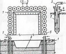 Рис. 5.6. Схема искусственного замораживания грунтов (размеры в м): 1—охлаждающая игла; 2—замораживающая наружная труба; 3 — питающая труба; 4 — патрубок для подсоединения к холодильной установке; 5 — замороженный грунт; 6—талый грунт