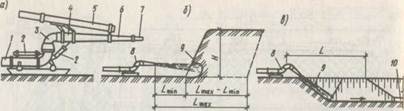 а—схема гидромонитора; 6 — встречный забой; в—попутный забой; /—водовод; 2 — гидроцилиндры управления; 3, 4 —шарнирное сочленение ствола с водоводом; 5 — рычаг; 6 — ствол; 7— насадка ствола; 8—гидромонитор; 9—фронт забоя; 10 — канава отвода пульпы