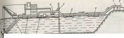 1—грунтозаборное устройство; 2—всасывающий трубопровод; 3—грунтовый насос; 4 — напорный пульпопровод; 5 — свайный ход; 6 — плавучий пульпопровод; 7—береговой пульпопровод; 8 — укладка грунта