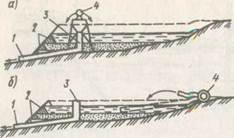 а —эстакадным способом; б —безэстакадным спо собом; 1—водовыпускная труба; 2—грунтовые валы (обваловывание); 3 — водосборный колодец (дренаж); 4—магистральный пульпопровод