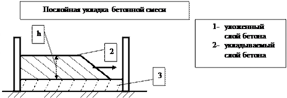 новая порция БС должна быть уложена до начала схватывания цемента в ранее уложенном слое. Укладку в небольшие в плане конструкции ведут сразу на всю высоту, в большие – горизонтальными слоями по всей площади. При многослойной кладке должно соблюдаться условие: