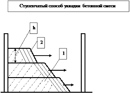 На больших массивах иногда невозможно перекрыть предыдущий слой бетона до начала схватывания в нем цемента, тогда применяют ступенчатый способ укладки с одновременной укладкой двух-трех слоев. Отпадает необходимость перекрывать слои по всей площади массива. Для удобства ведения работ длину ступеней принимают не более 3м.