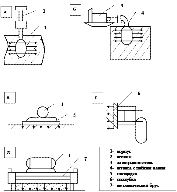 Внутренние вибраторы типа «булавы» (рис а) применяют для уплотнения БС, укладки в массивные конструкции с различными степенями армирования. А внутренние с гибким валом (рис б) – в различных типах густоармированных конструкциях. Поверхностными вибраторами – поверхностная рабочая площадка (рис в) и поверхностная виброрейки (рис д) – уплотняют только верхние слои бетона тонких плит и полов. Наружными вибраторами уплотняют БС в густоармированных тонкостенных конструкциях.