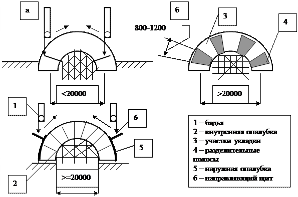 На крутых участках арок или сводов бетонирования ведут в двусторонней опалубки, наружные щиты которые наращивают по ходу процесса