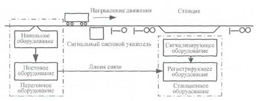 Когда средства контроля обнаруживают перегретые буксы, дефектные колеса или волочащиеся детали, сигналы об этом со станционного оборудования передаются на сигнальный световой указатель, установленный между перегонным оборудованием и входным сигналом станции, а также на сигнализирующее оборудование.