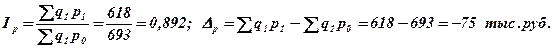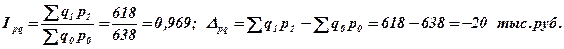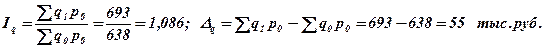 | Цена за 1 кг., руб. p0 | Продано, т. q0 | Цена за 1 кг., руб. p1 | Продано, т. q1 | p0q0 | р1q1 | p0q1 | |
