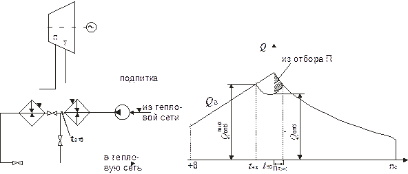 | При t н < t нa включаются основной подогреватель и пиковый водяной котел. При включении в работу водяного котла загрузка теплофикационного отбора не меняется, что можно обеспечить при постоянном расходе в сети выдерживая постоянный перепад давления по сетевой воде на основном подогревателе. |