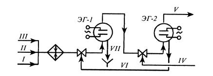 Рисунок - 1 Принципиальная технологическая схема установки электрообессоливания нефти: I - сырая нефть, II - эмульгатор, III - содо-щелочной раствор, IV - свежая вода, V- обессоленная нефть, VI - вода из электродегидратора 2, VII- соленая вода из электродегидратора 1.