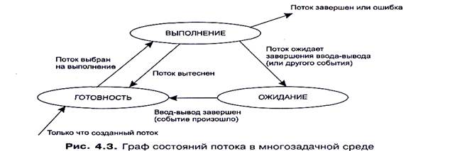 Только что созданный поток находится в состоянии готовности, он готов к выполнению и стоит в очереди к процессору. Когда в результате планирования подсистема управления потоками принимает решение об активизации данного потока, он переходит в состояние выполнения и находится в нем до тех пор, пока либо он сам освободит процессор, перейдя в состояние ожидания какого-нибудь события, либо будет принудительно «вытеснен» из процессора, например вследствие исчерпания отведенного данному потоку кванта процессорного времени. В последнем случае поток возвращается в состояние готовности. В это же состояние поток переходит из состояния ожидания, после того как ожидаемое событие произойдет.