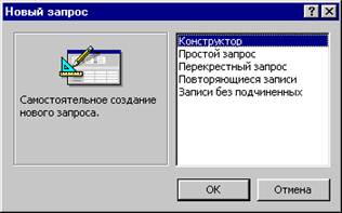 В диалоговом окне Новый запрос выберите Конструктор и нажмите кнопку ОК