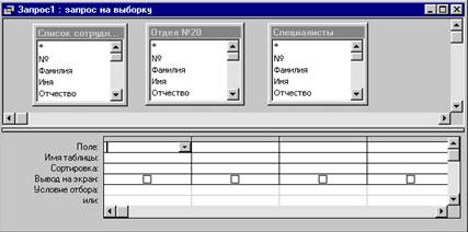 Дважды щёлкните по именам тех полей, которые должны присутствовать в бланке запроса. Выбирайте поля в том порядке, в котором они должны появиться в результатах запроса. При ошибочном вводе поле можно удалить, если его выделить и нажать клавишу Delete