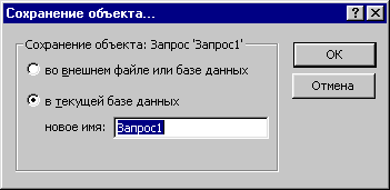 В диалоговом окне Сохранение объекта введите имя запроса, установите переключатель в текущей базе данных и нажмите кнопку ОК