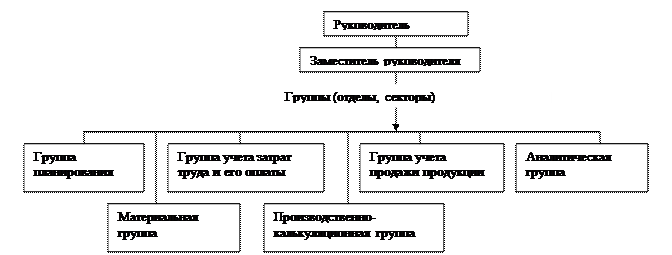 В средних организациях в состав службы управленческого учета можно включить следующие группы (отделы, бюро, секторы): планирования, материальная, учета затрат труда и его оплаты, производственно-калькуляционная, учета продажи продукции, аналитическая.