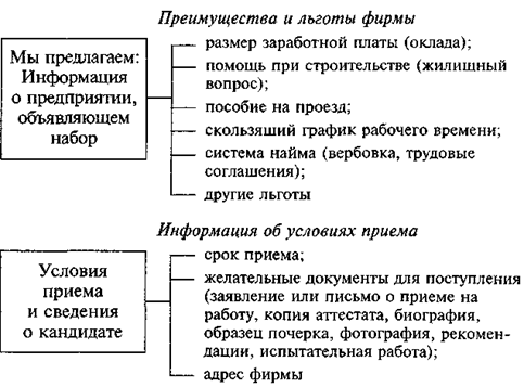 Качественный аспект процесса набора состоит в том, чтобы найти кандидатов, имеющих необходимую для ра боты квалификацию. Здесь важно дать полную характеристику наличия свободных мест. Можно использовать следующую схему объявления о наличии свободных мест (рис. 8.3).