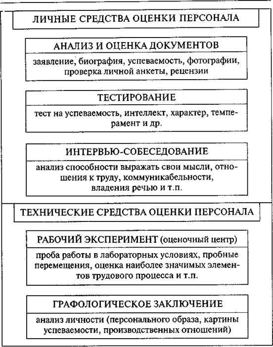 В группе личных средств оценки персонала наибольшую сложность представляет собой проведение интервью-собеседования. Интервью-собеседование не является идеальным методом личностной оценки претендента, поэтому оно дополняется другими методами. Основная цель собеседования — получить ответ на вопрос, заинтересован ли кандидат на вакантную должность в данной работе и способен ли он качественно ее выполнить.