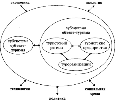 Таким образом, туризм как открытая система находится во взаимосвязи с внешним миром, представленным такими общественными системами, как экономика, экология, социальная среда, политика и технологии. Система туризма разделяется на две субсистемы: субъект управления туризмом и объект управления туризмом.