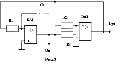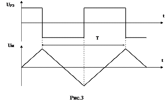 Генератор треугольного и прямоугольного напряжений (ГТН и ГПН), функциональная схема которого показана на рис.1, включает в себя интегратор И и релейный элемент РЭ, соединенные последовательно; причем между выходом РЭ и входом И существует обратная связь. На рис.2 показана принципиальная схема генератора.