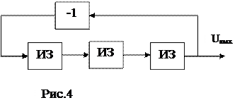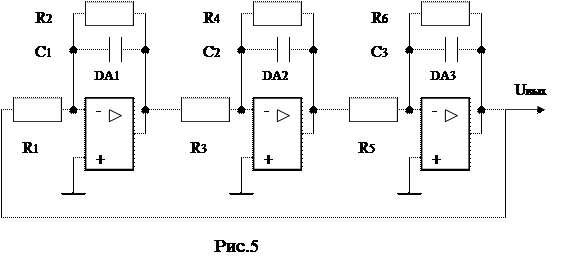 Все усилители реализуют модель инерционного звена (ИЗ). Цепочка из инерционных звеньев в сочетании с отрицательной обратной связью между выходом третьего и входом первого инерционного звена создает необходимые условия для генерации на выходе синусоидального напряжения. Электрическая схема генератора показана на рис.5.