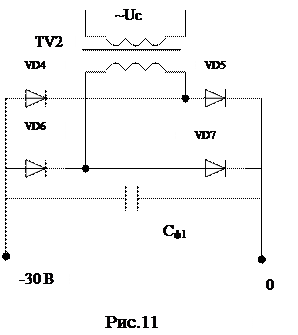 Принципиальная схема блока питания (БП) для системы управления УВ приведена на рис.11. На схеме рис.11 обозначено: