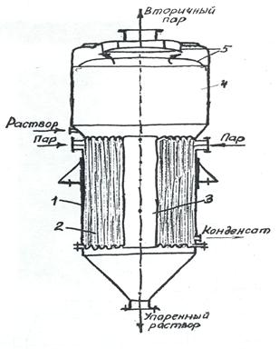 На рис. 1.7. приведена схема испарительного аппарата с центральной циркуляционной трубой типа ВВ. Он состоит из греющей камеры - 1, пучка кипятильных труб – 2, циркуляционной трубы – 3, сепарационного (парового) пространства – 4, брызгоотделителя (отбойника) - 5.