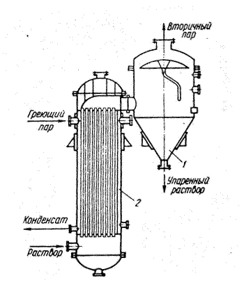 Часто в технологии встречаются растворы, кипение которых сопровождается пенообразованием. При вспенивании увеличивается унос капель и кристаллов из раствора с вторичным паром, быстрее засоляются греющие поверхности в последующих аппаратах, где этот пар конденсируется. Для упаривания пенящихся растворов применяют выпарной аппарат с выносной поверхностью нагрева (рис. 1.10), так как в основном в нем происходит самоиспарение перегретой в трубах жидкости при поступлении ее в сепаратор. При этих условиях жидкость испаряется спокойно, и при достаточных размерах сепаратора не происходит уноса капелек жидкости и пены со вторичным паром.